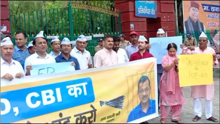 आम आदमी पार्टी के राष्ट्रीय संयोजक और दिल्ली के मुख्यमंत्री अरविंद केजरीवाल को केंद्र की भाजपा सरकार द्वारा ED और सीबीआई जैसी सरकारी एजेंसी का दुरुपयोग करके उनके गिरफ्तारी के खिलाफ देहरादून के गांधी पार्क के बाहर आम आदमी पार्टी के नेताओं और कार्यकर्ताओं ने धरना प्रदर्शन करते हुए केंद्र सरकार के खिलाफ जमकर नारेबाजी की। वही प्रदेश उपाध्यक्ष विशाल चौधरी ने बताया कि आज आम आदमी पार्टी राष्ट्रव्यापी भाजपा सरकार के खिलाफ विरोध प्रदर्शन कर रही है जिस प्रकार से दिल्ली में शराब घोटाला हुआ है और उसमें न्यायपालिका ने अरविंद केजरीवाल को निर्दोष करार दिया किया है उसके पश्चात भी जिस प्रकार से भाजपा षड्यंत्र करते दिख रही है यह उसकी हताशा और निराशा है आगे उन्होंने कहा कि उन्हें डर है कि यदि अरविंद केजरीवाल जेल से बाहर निकलते हैं तो आगामी दिल्ली का विधानसभा चुनाव और हरियाणा के विधानसभा चुनाव में आम आदमी पार्टी पूर्ण बहुमत के साथ सरकार बनाएगी आगे उन्होंने कहां की भाजपा नेताओं के सपने में आज भी अरविंद केजरीवाल आते हैं और उन्हें डराते हैं।